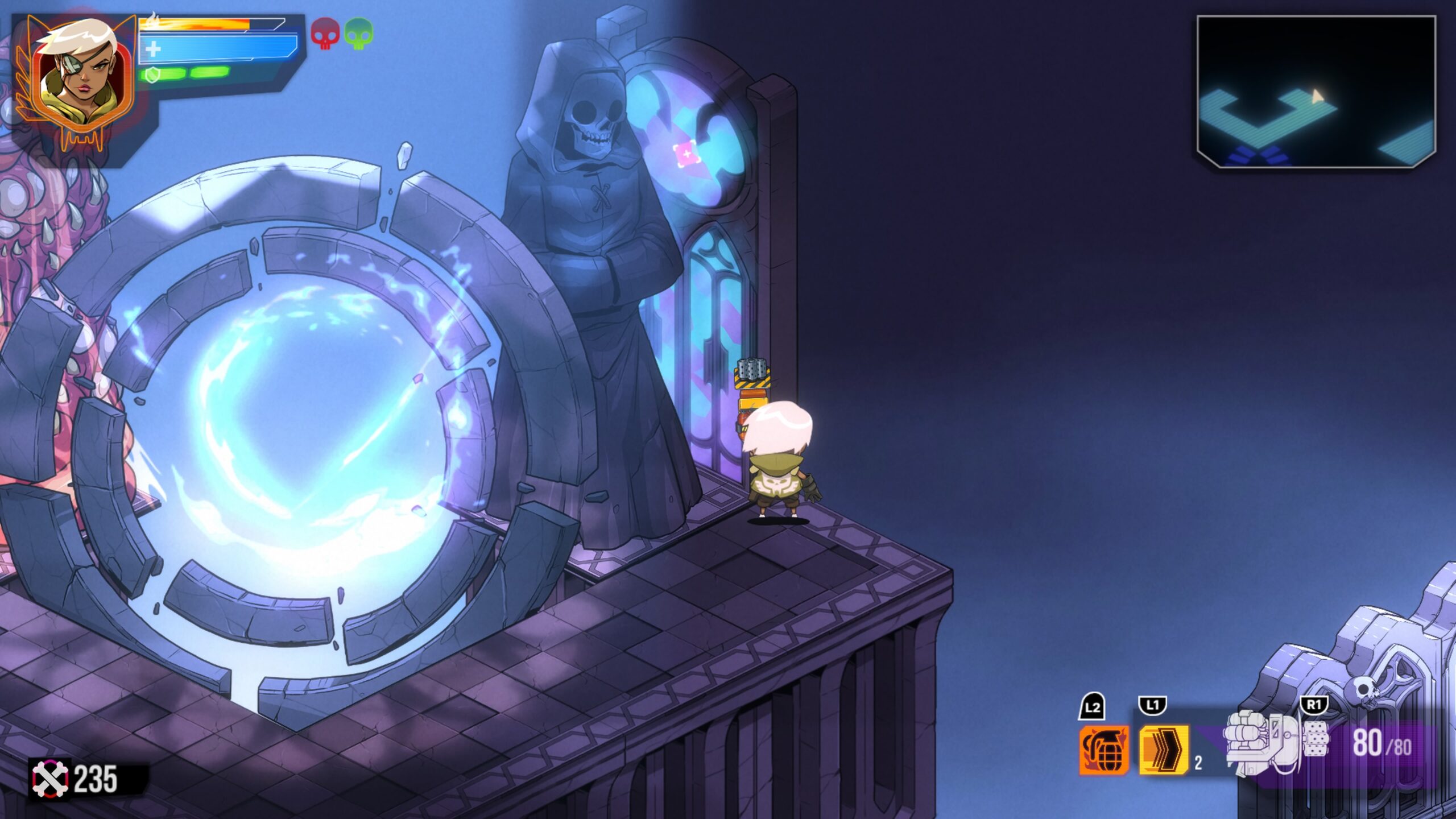ポータルと回復ポイント、ステージの最初に回復ポイントがありHP弾数回復できあとお買い物ができる、買い物に関しては敵倒したり道中で死んでいる骸を漁ってお金集めるよう、銃と後述する特殊能力を強化できる、あと残機増やせるけどやり直し聞くからあんまり必要性が感じられなかった、ただ残機増やすと回復ポイントの周りに猫が増える。