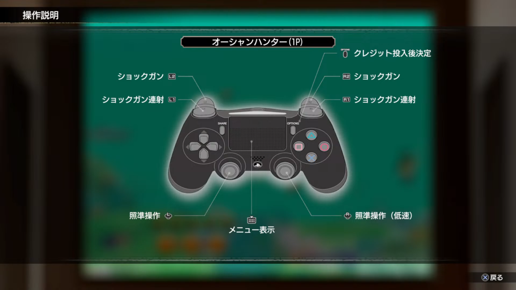 操作方法、アーケードではボタン押しっぱなしで連射だったからL2R2の単発はあまり使わないかな、L1R1の連射のが今までの感じでできると思う、仕方がないけどコントローラーだと端から端に敵が出てくると間に合わないことが多くて少しだけガンコンとコントローラーとで難易度変わりそう。