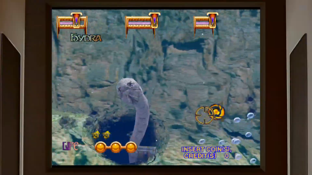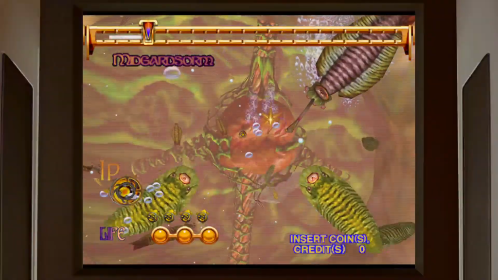 ステージの後半になるとボスのミドガルズオルムに食べられて体内を進んでいくことになる、音が響いて薄暗くホラーゲームの様な印象、敵は三葉虫?とか何かの幼虫みたいのがくっついてきて噛みついてくる。