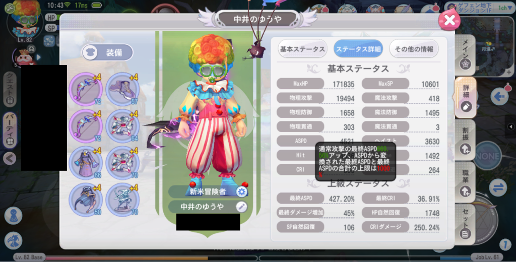 攻速(ASPD)に関しては、スキル込みで1000%を超えており、これ以上伸ばしても伸び代が少ないので、火力に振っていくことにしました。結構ウキウキで火力を確認しに行った結果がこちら。