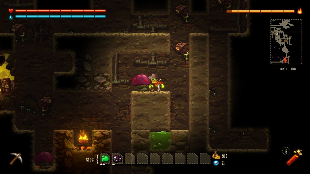基本は下に進みつつ、途中にある宝石や鉱石を集めて拠点に戻り換金。新しい装備を買い揃えて、再び潜っていく……というゲーム性です。