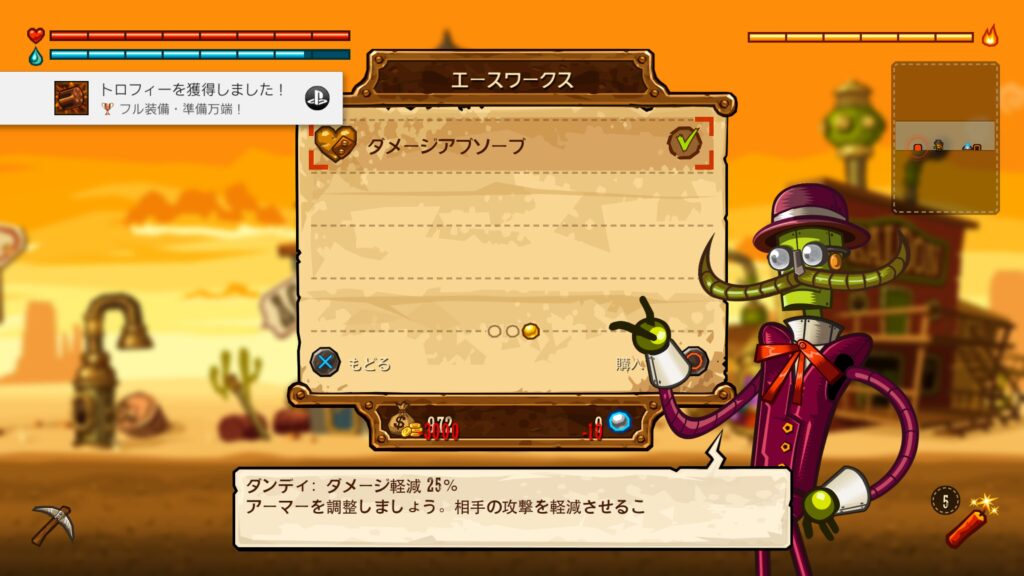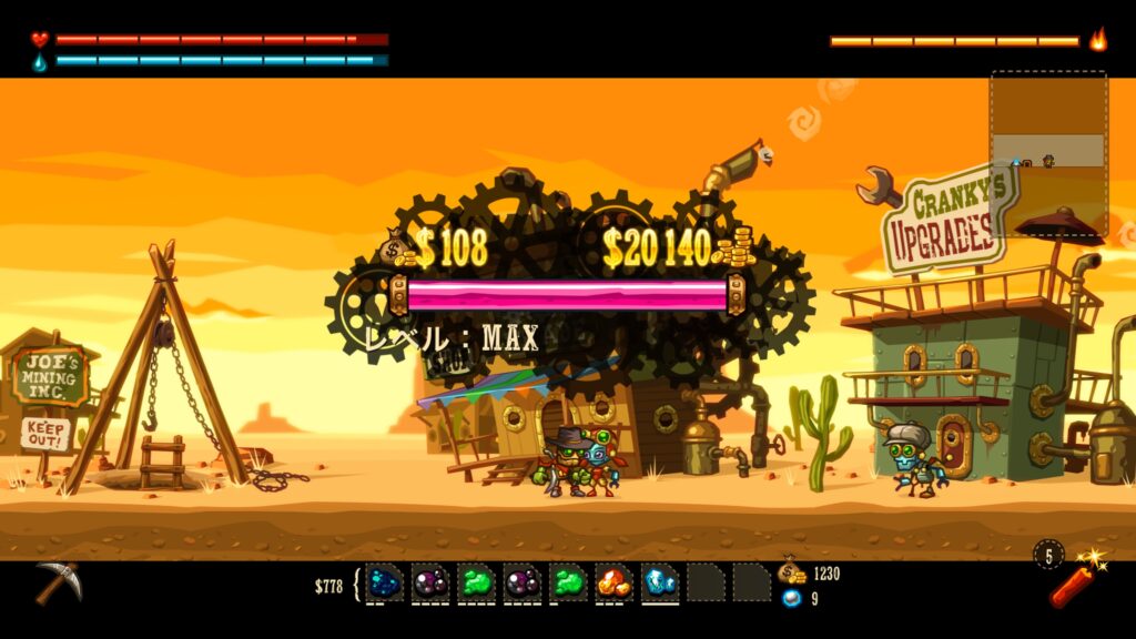 アイテムに関しては序盤は少ないですが、「レベル」という概念があり、それが上がれば徐々にショップへ追加されていきます。ピッケル、ランタン、便利アイテムや燃費が良くなるアイテムなどがあります。