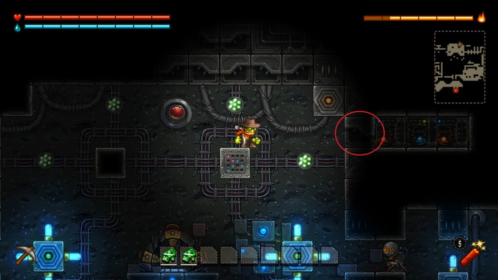 後半のエリアですが、画像赤丸のような場所に隠し通路が多いように感じました。道中で得られる能力には「アイテムがどこにあるか」を表示してくれるものがあります。それで場所はわかるけど取り方がわからない……というものがあれば、このようなブロックを探してみるといいかもしれません。