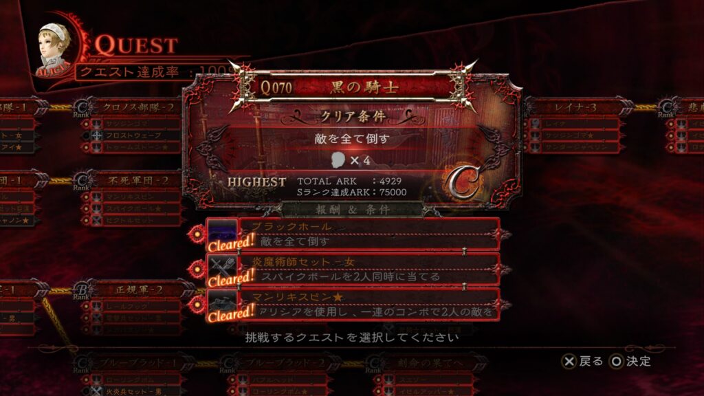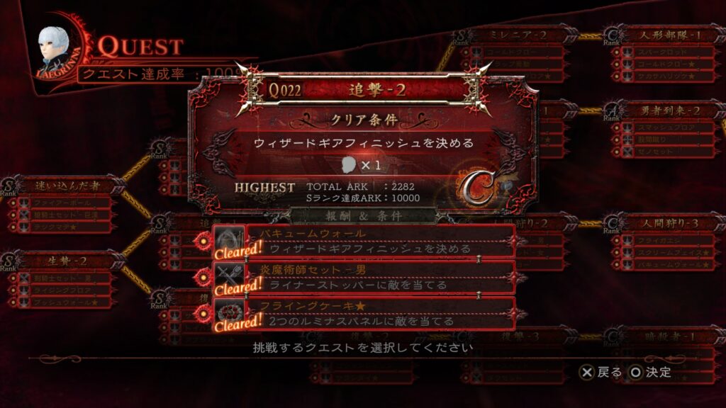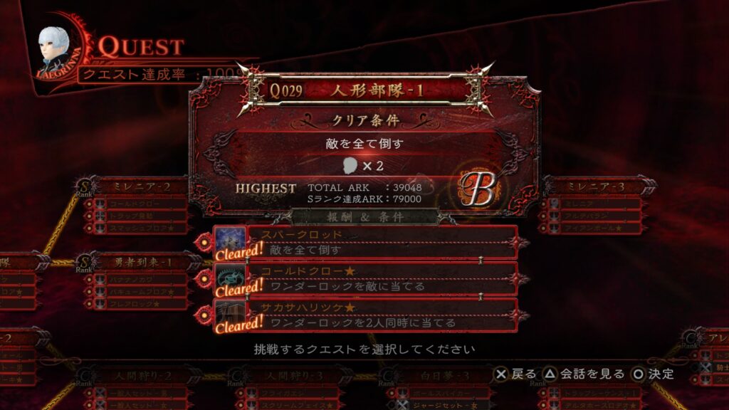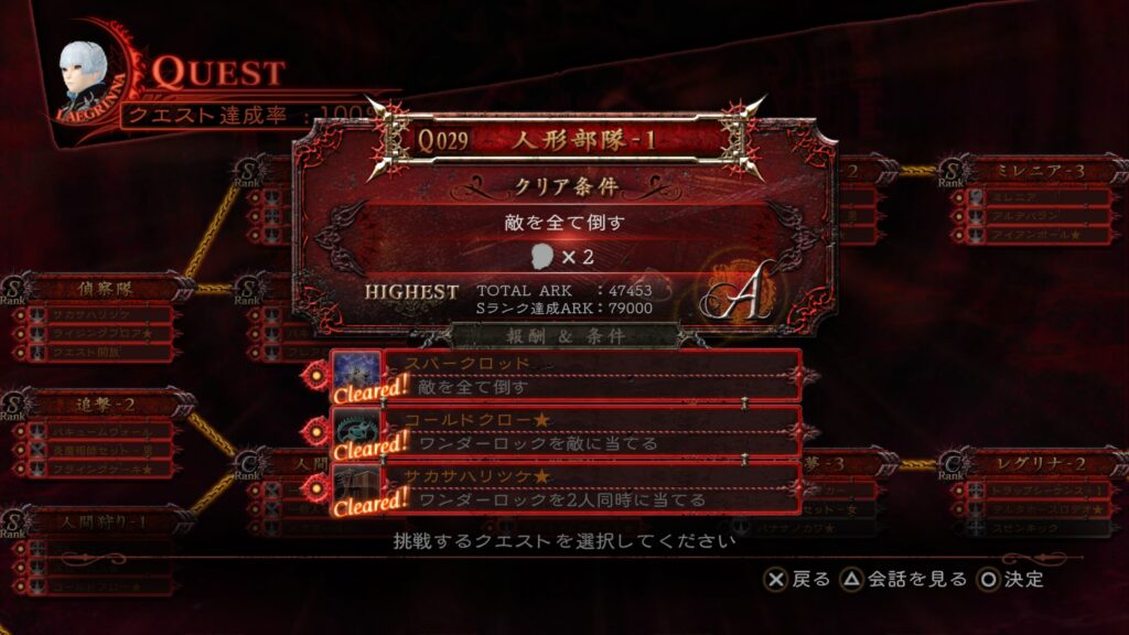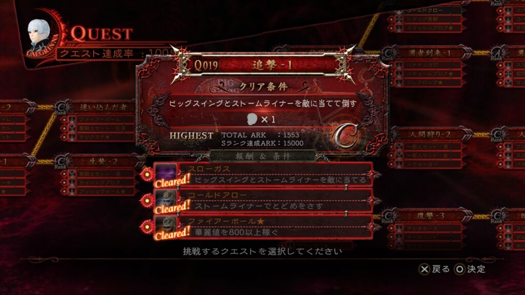 前回ストーリーをクリアしたので、今回から達成できていない「追加条件」と「クエストランクS」を埋めていく。
