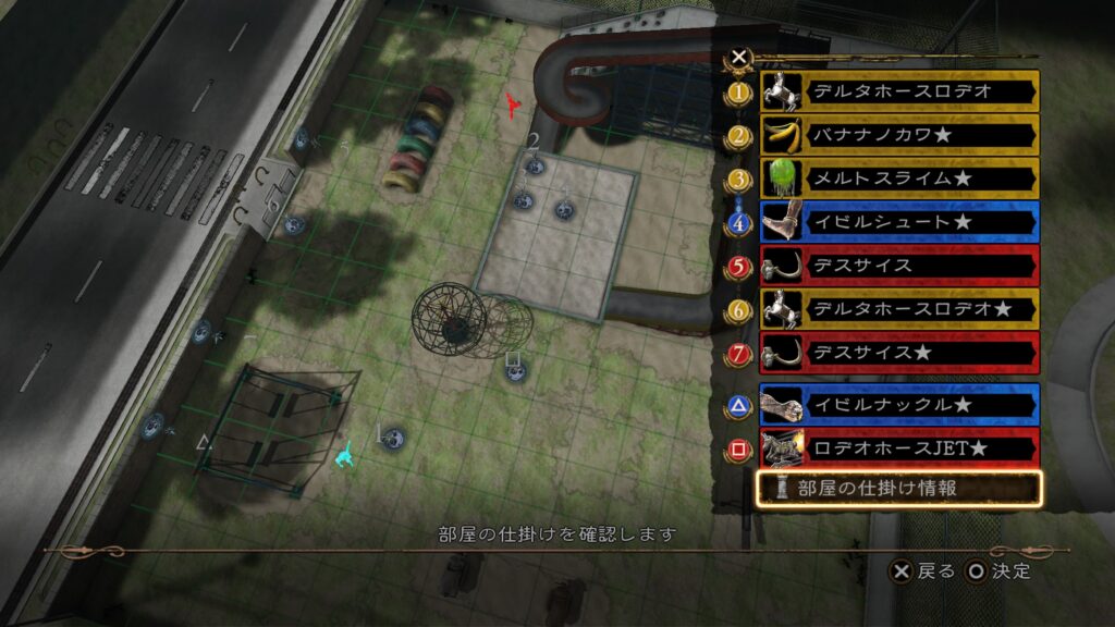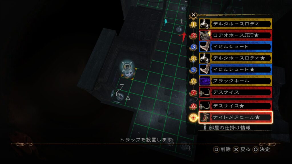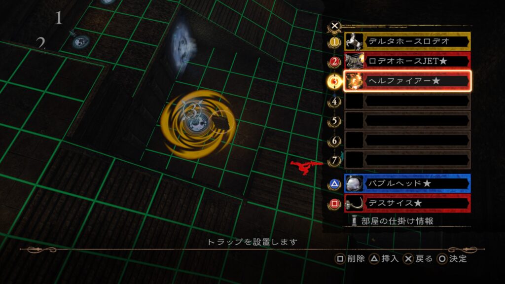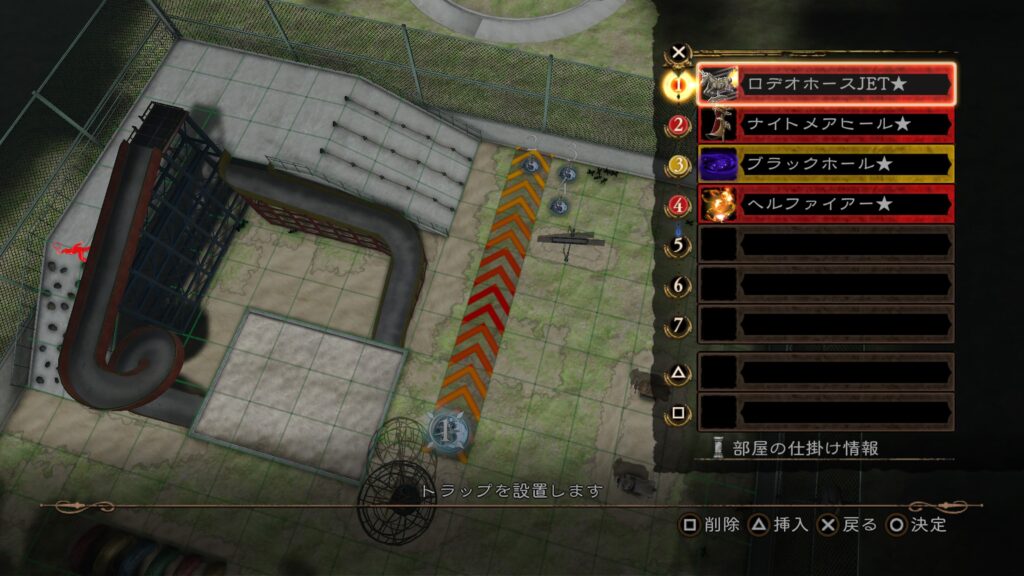 わかりやすく、前半の最後のトラップ「ロデオホースJET」を1に配置している。あくまでもわかりやすくするためなので、実際に繋げる際は2のナイトメアヒールから使用してください。