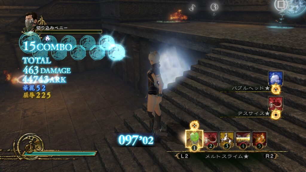 敵が5人出てくるが、5人全員に12個もトラップを当てていくと、時間が無くなり失敗になってしまうのでどこかで切り上げるべきだ。画像は確か、3人にコンボを繋げて、残りの二人に適当なコンボを繋げた際のARK。