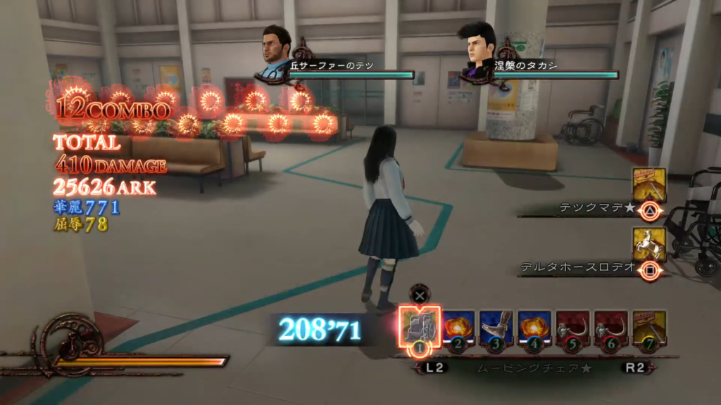 敵が2人いて案外攻撃が激しいので、メリーゴーランドの周りをぐるぐる回るか、「スローウェーブ」などで遅延して安全にコンボを繋げたい。
