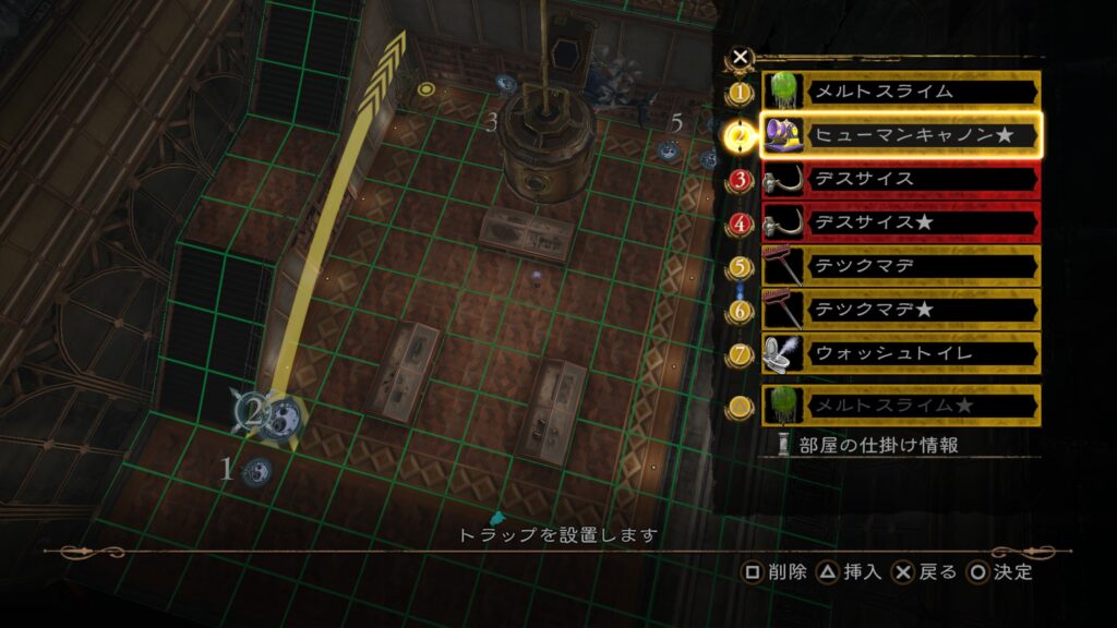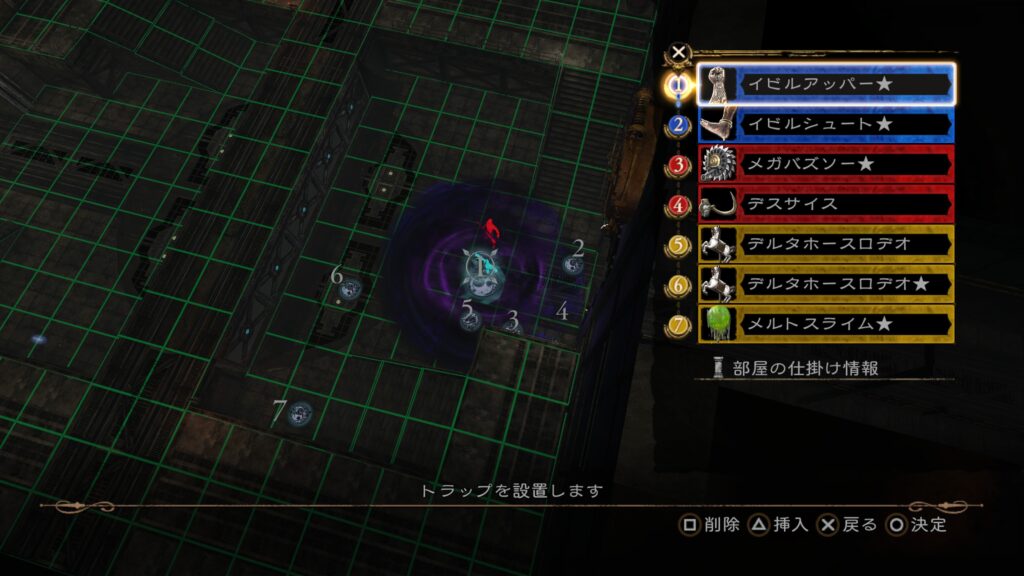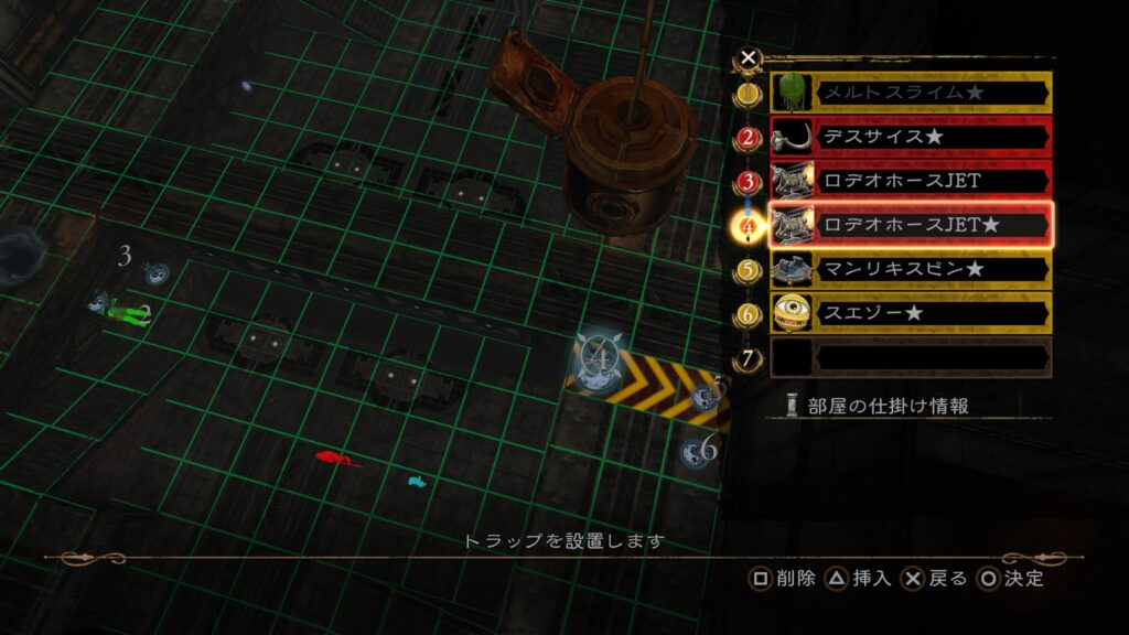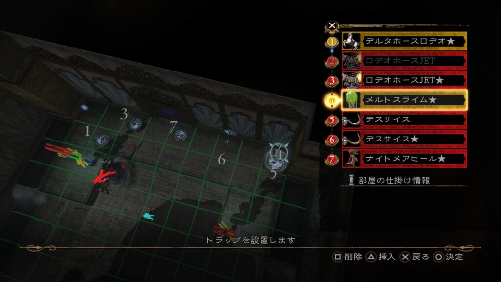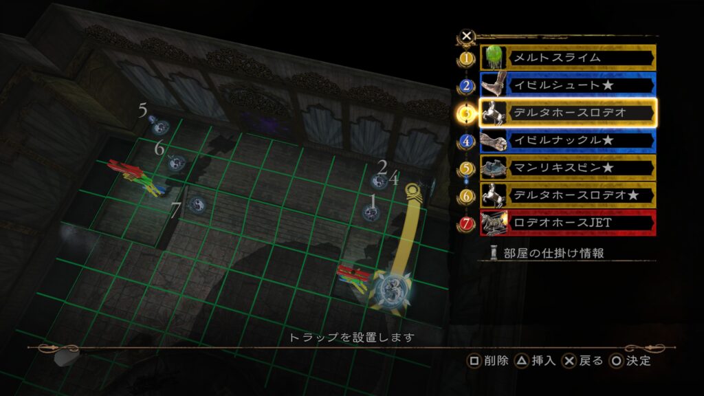 その後は前半7の「メルトスライム」まで当てて、後半のトラップ構成を行う。3の「ロデオホースJET」を当てると上段まで吹き飛ぶので注意。床ではなく上段にトラップを仕掛けておきたい。
