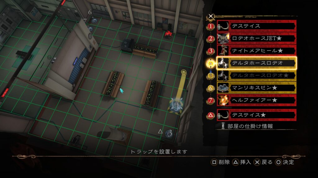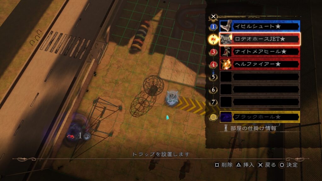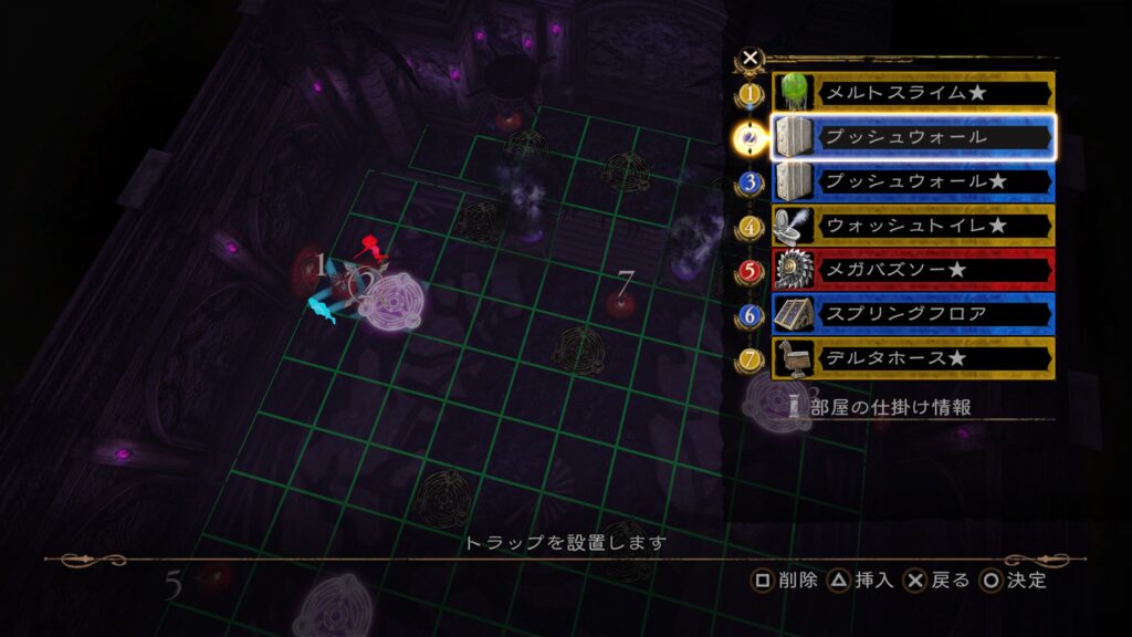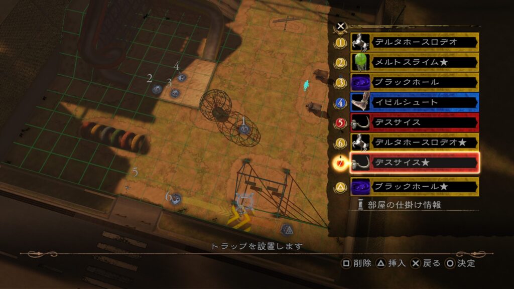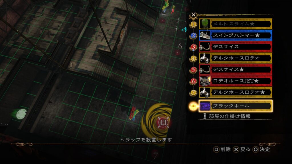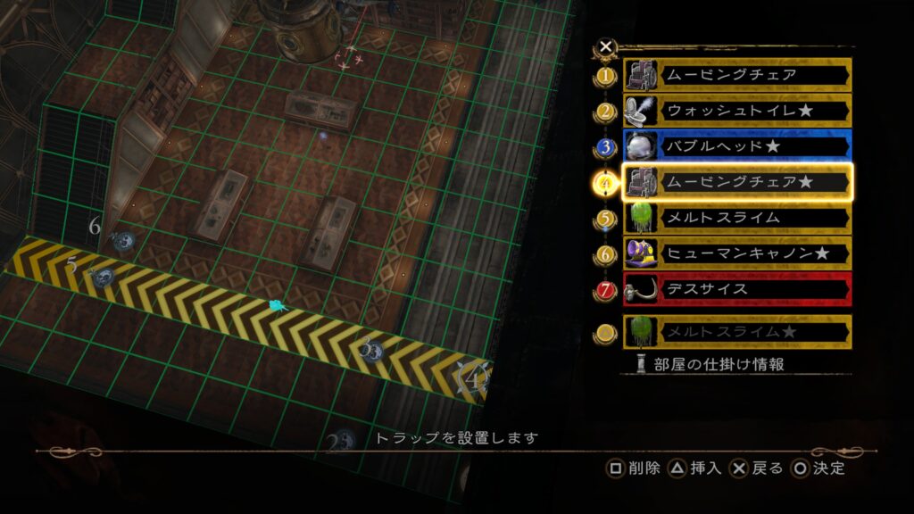 その後は前半7の「メルトスライム」まで当てて、後半のトラップ構成を行う。3の「ロデオホースJET」を当てると上段まで吹き飛ぶので注意。床ではなく上段にトラップを仕掛けておきたい。