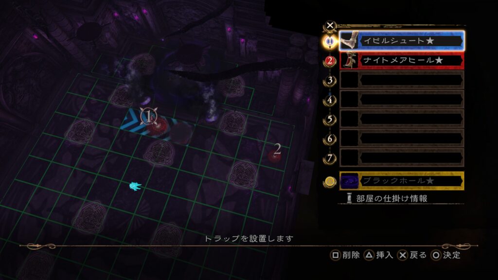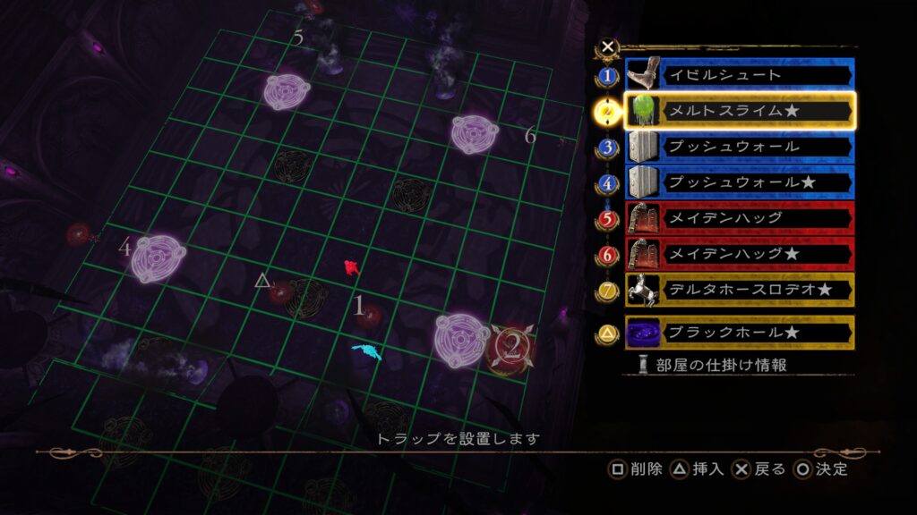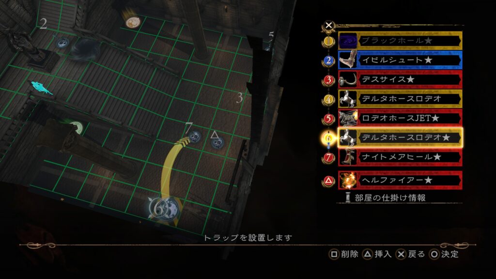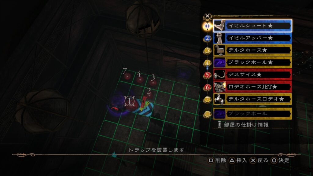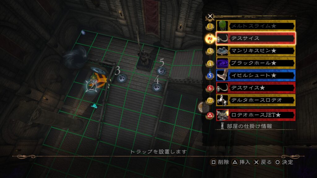 1の「メルトスライム」から2の「デスサイス」で部屋の仕掛け「打ち上げる床」に当てる。その後「マンリキスピン」で位置調整し、「大騎士像」を当てて「ブラックホール」を発動させ、敵を動かす。この間に後半のトラップを構成しておく。