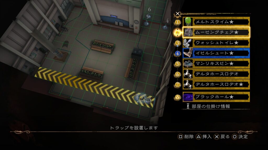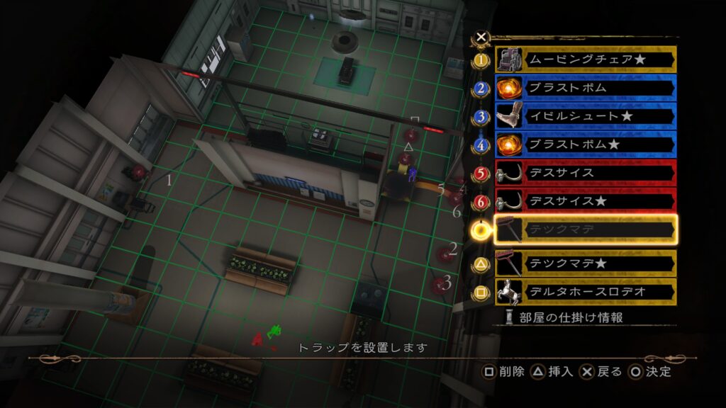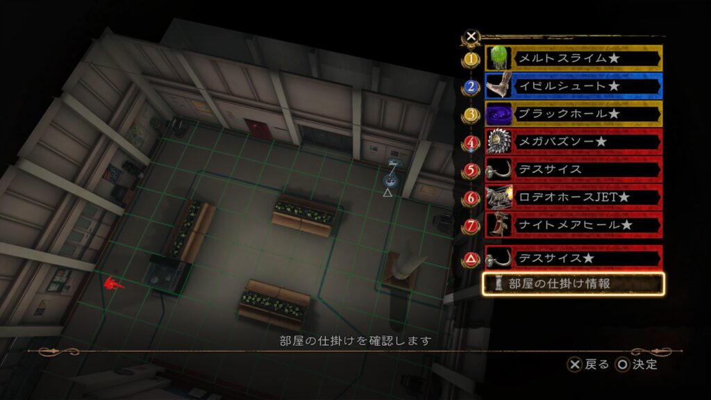 これに部屋の仕掛け「移動する椅子」×2と「手術台」を挟む。これでクリア条件とSランクを達成できる。
