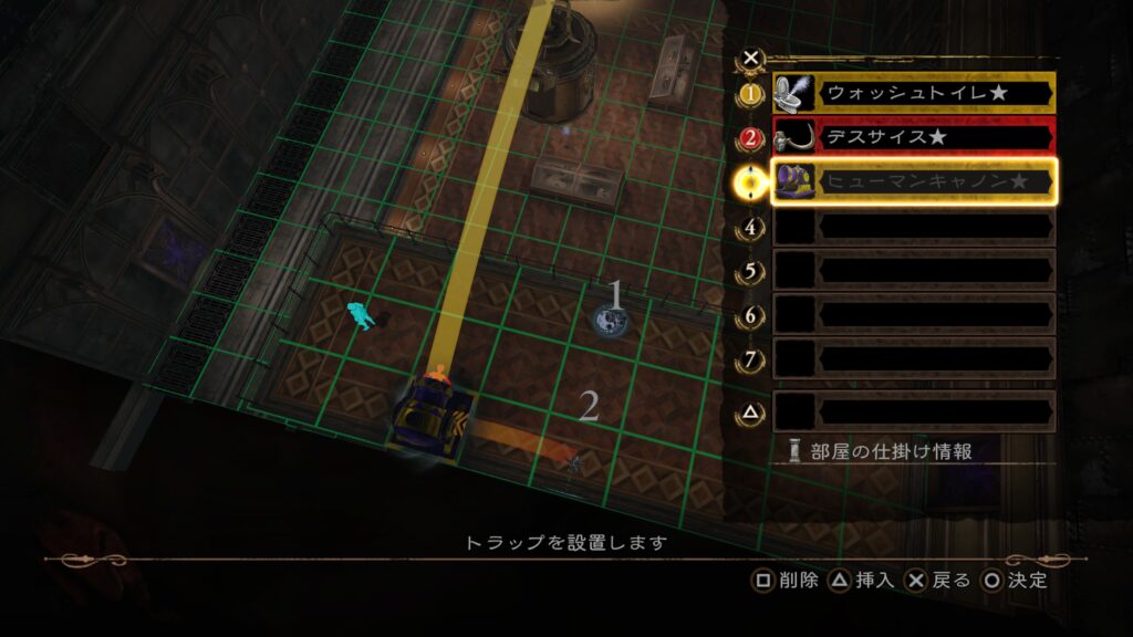 1の「ムービングチェア」は一人だけ運べるので採用した、敵を乗せた後たまに他の敵を轢いてしまうが死ぬことはないので轢いても問題ない、当てた後は手早くトラップを発動させ「デスサイス」を発動させた辺りで後半のトラップを構成する。