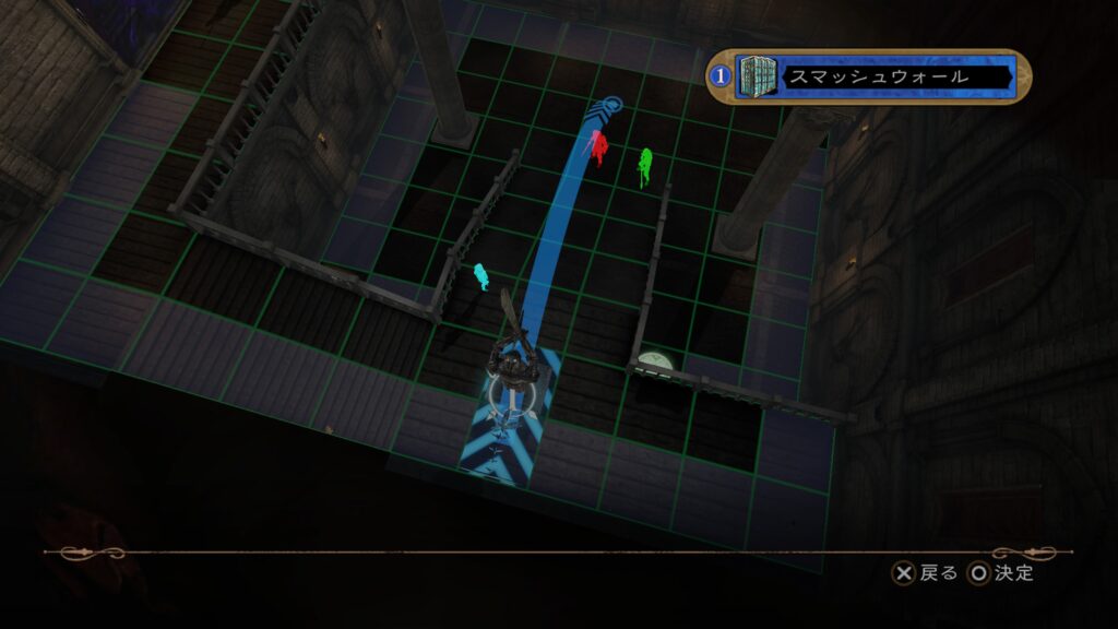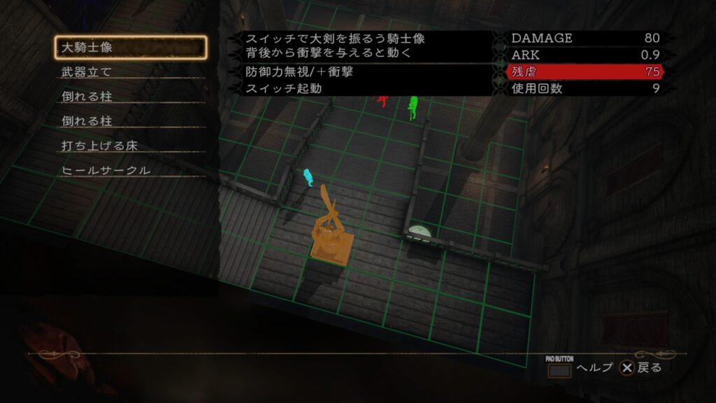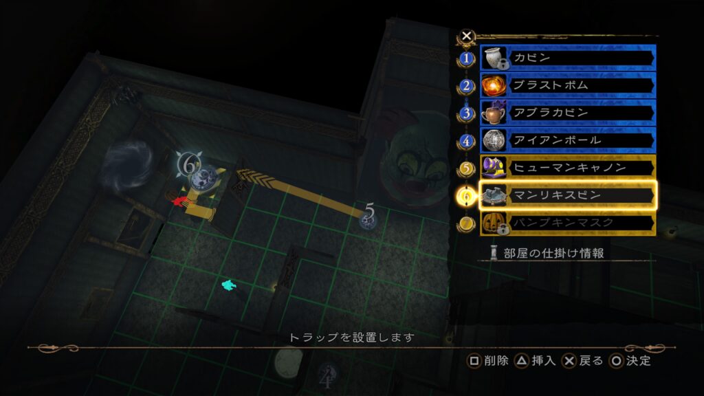 私は大騎士像の仕掛けを活用しました。まず3人の敵のうち2人を集め、騎士像を移動させて死ぬまで発動し続けます。これでトラップ消費は2回。残り2回でもう1人を倒せばクリアです。この「仕掛けはカウント外」というルールに気づくまで、かなりの時間がかかりました。