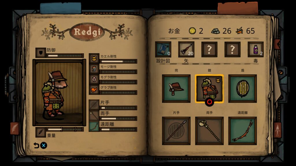 盾は本当によくわからない、防御がそこそこ高く重量が遅くならない程度の物を装備している、たまに貫通しているけど原理がよくわからないので不明。