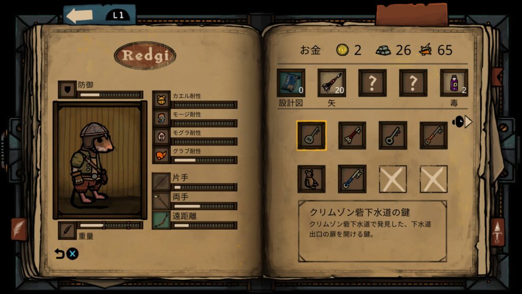 武器に関しては片手武器の方は兎に角軽いもの、攻撃は基本両手武器で行うので使わず重量に関わらないものを装備している。